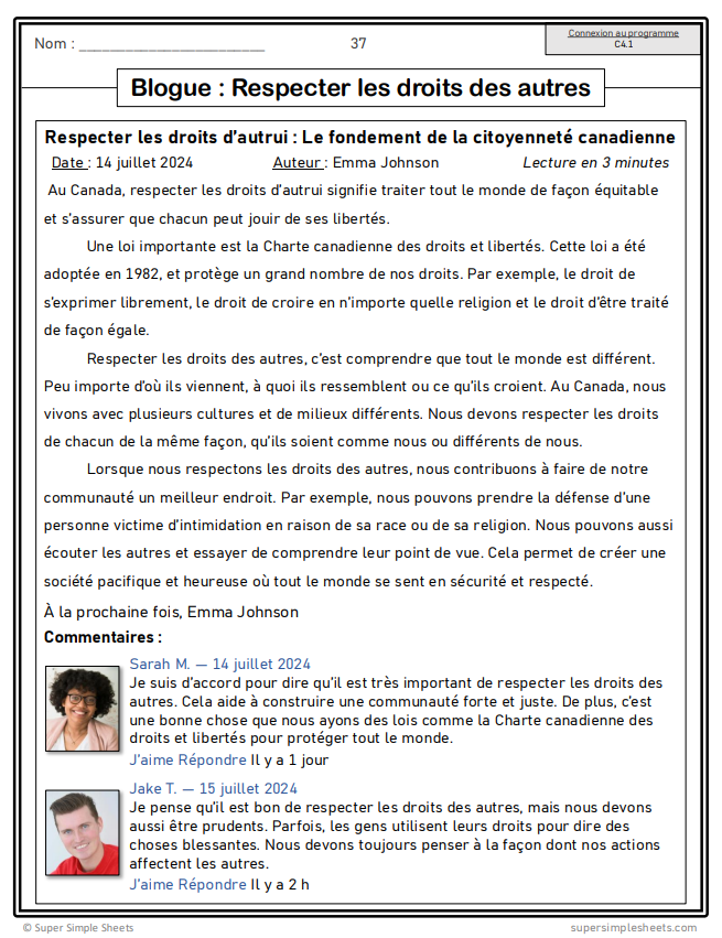 ✔️ Citizenship – Teaches about les droits et responsabilités, la Charte canadienne, equality, protests, and key figures like Viola Desmond.