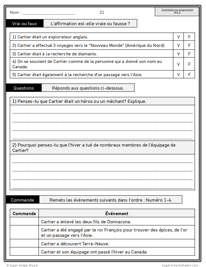✔️ Time and Place – Focuses on les frontières, early European exploration, Indigenous treaties, la colonisation, the fur trade, and la Confédération.