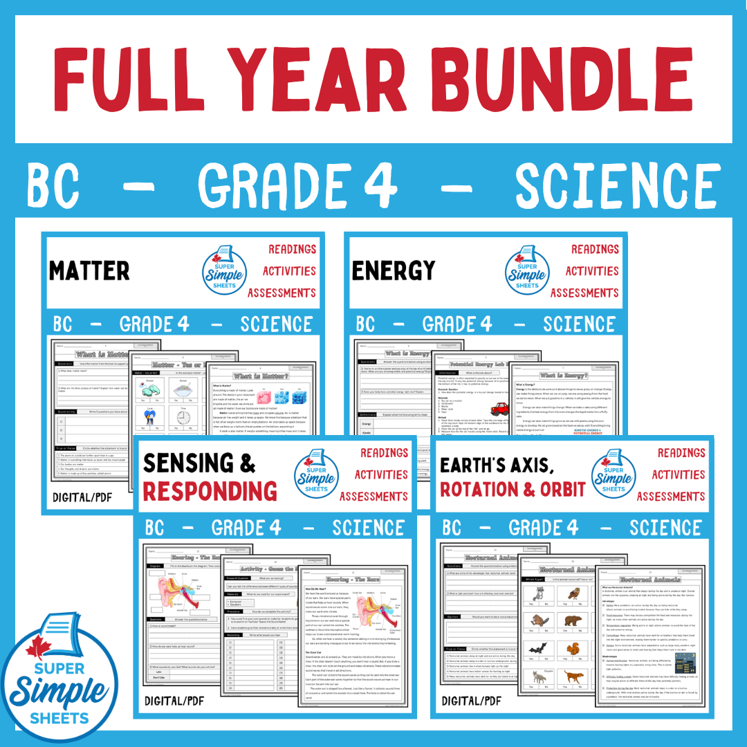 DIGITAL AND PDF VERSIONS BOTH INCLUDED! FULL YEAR BUNDLE - Great for distance teaching! This product covers the entire British Columbia Grade 4 Science curriculum: Aquatic and Terrestrial Biomes, Sensing and Responding, Conservation of Energy, Matter (Effects of Temperature), and Space (Moon, Sun, and the Earth - Axis, Orbit, and Rotation).