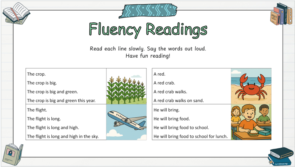 - Fluency readings for each week using the word list for that week