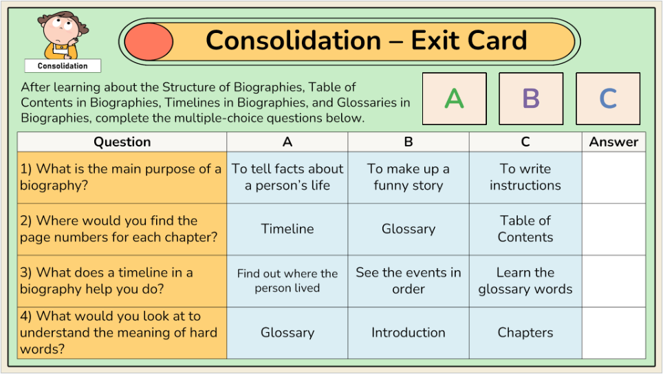 - Text features in biographies – using a table of contents, icons, and indexes to understand a biography