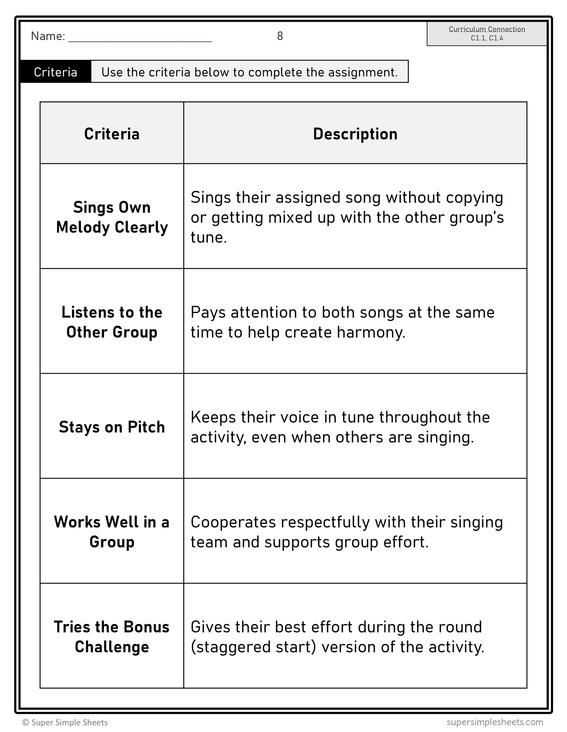 - Criteria to keep students and teachers focused on the elements of music being taught