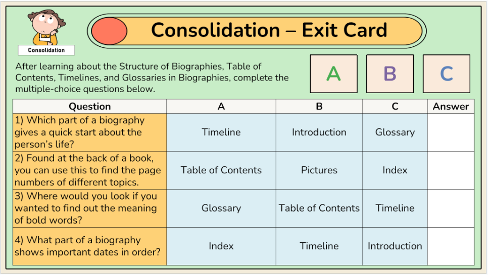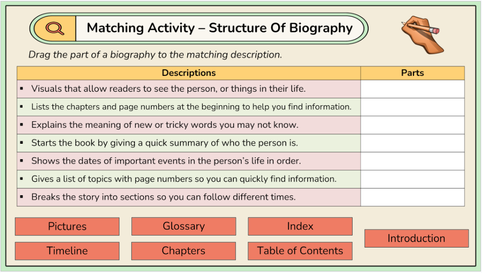 - Text features in biographies – using a glossary and indexes to understand a biography