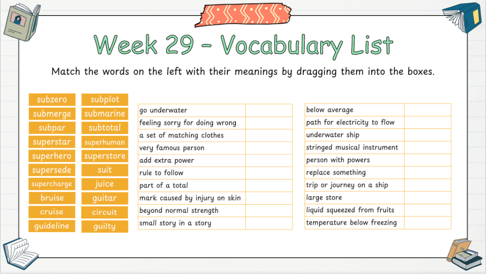 - Vocabulary development: morphemes, prefixes, suffixes, and word origins