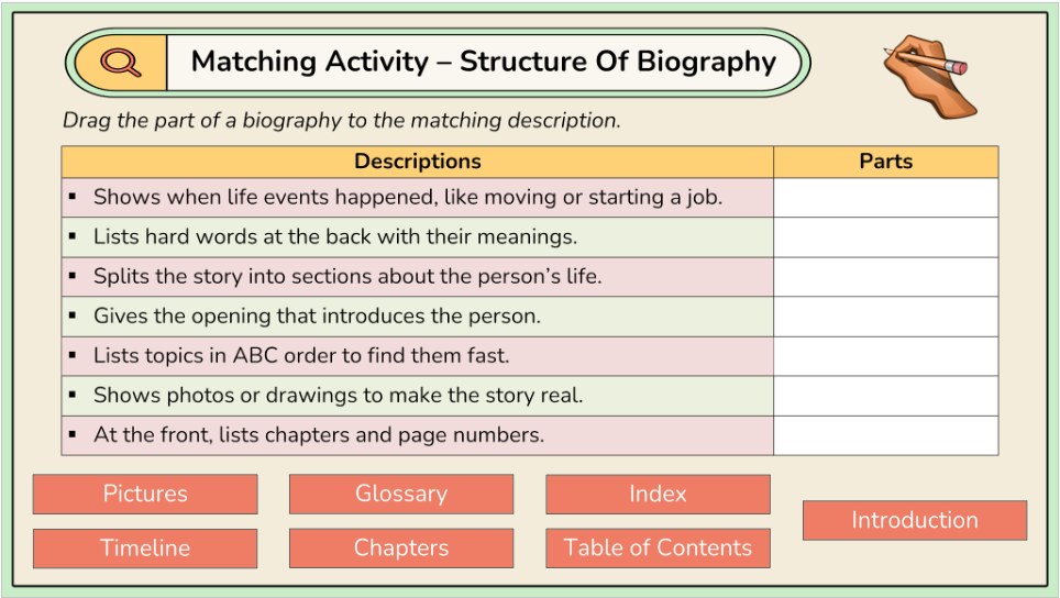 - Text features in biographies – using a glossary and indexes to understand a biography