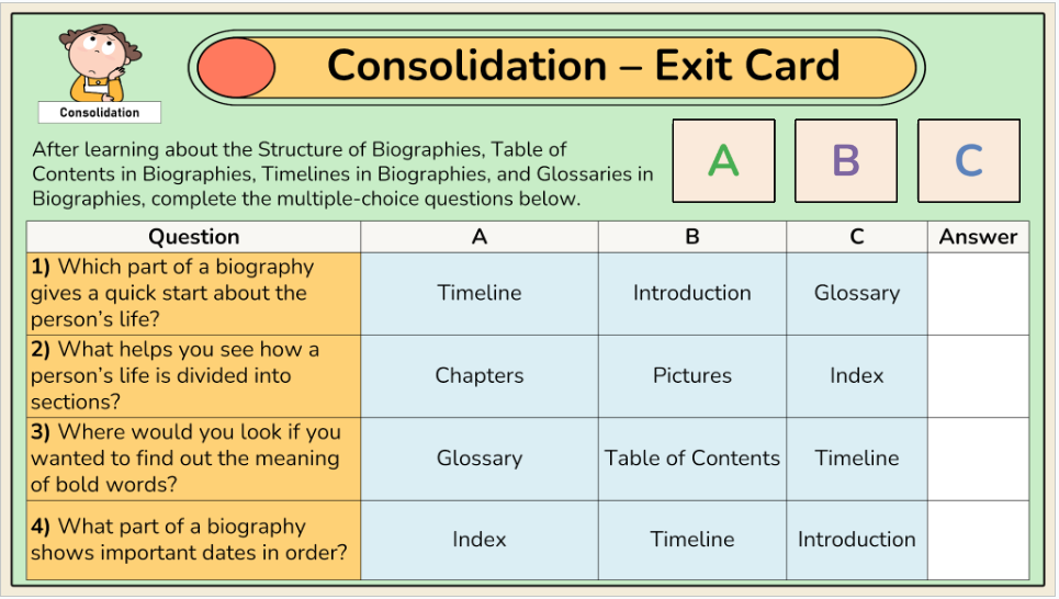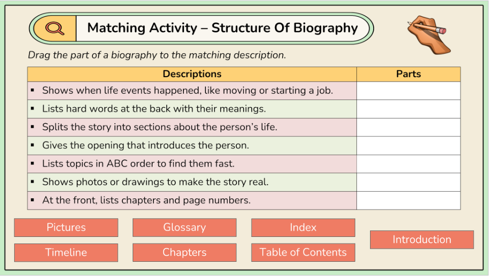 - Text features in biographies – using a glossary and indexes to understand a biography