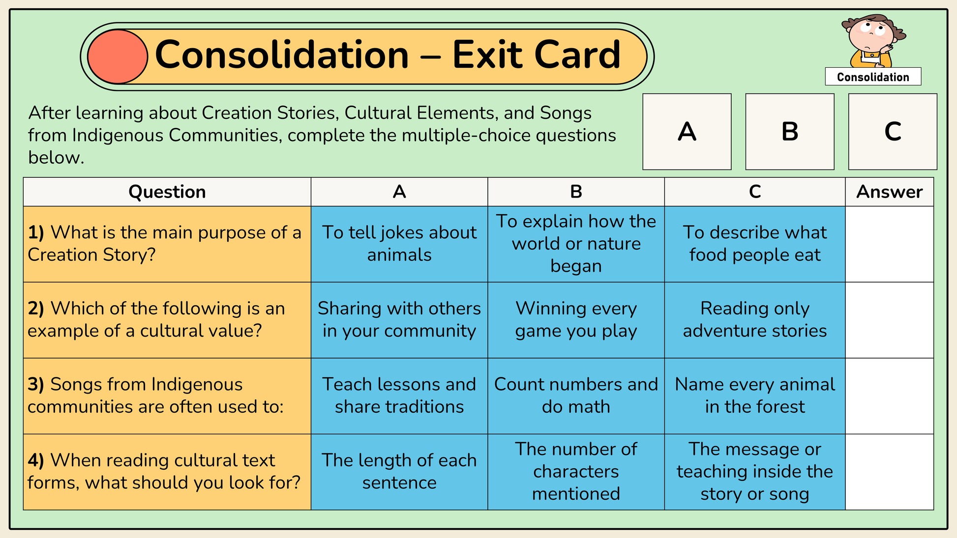 C1. Knowledge about Texts – taught using 10 different text forms, including narratives, cultural texts, and reports.
