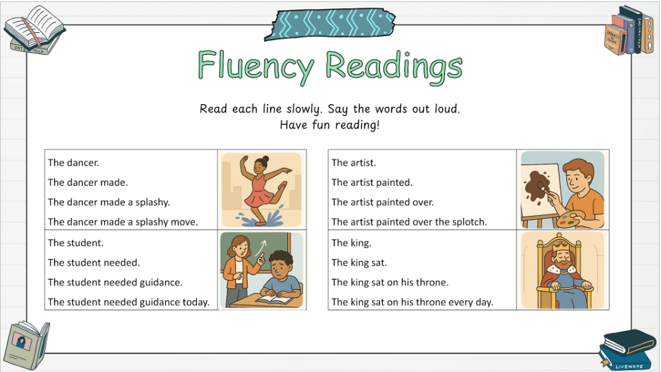 - Fluency readings for each week to reinforce word list vocabulary