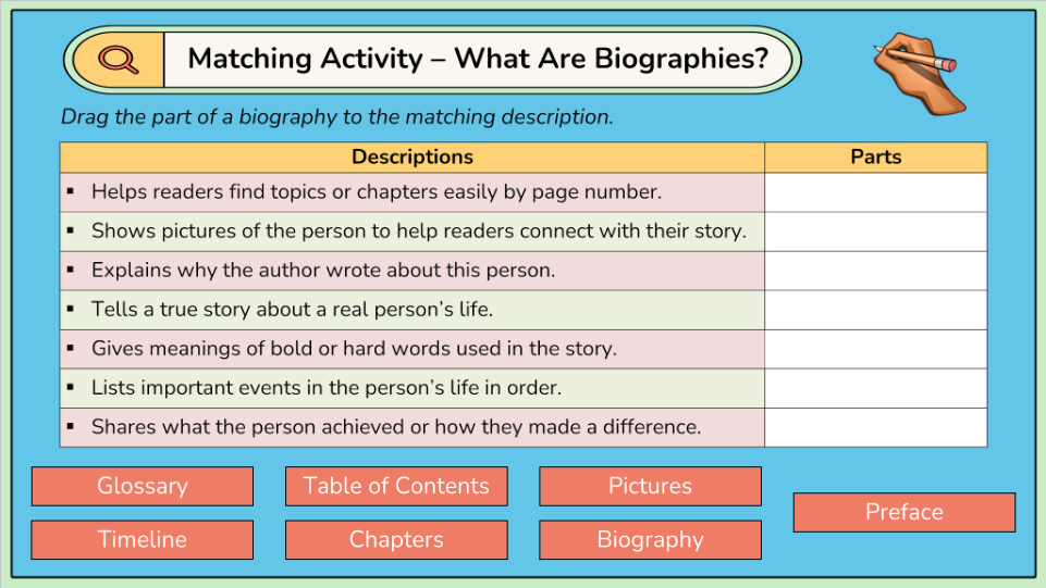 - Text features in biographies – using a glossary and a preface to understand a biography