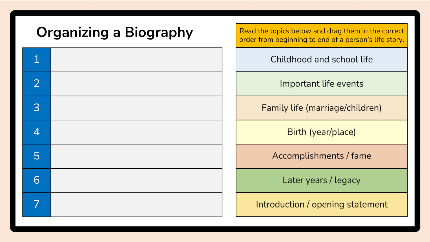 - Narrative structure – 5 main parts: exposition, rising action, climax, falling action, and resolution