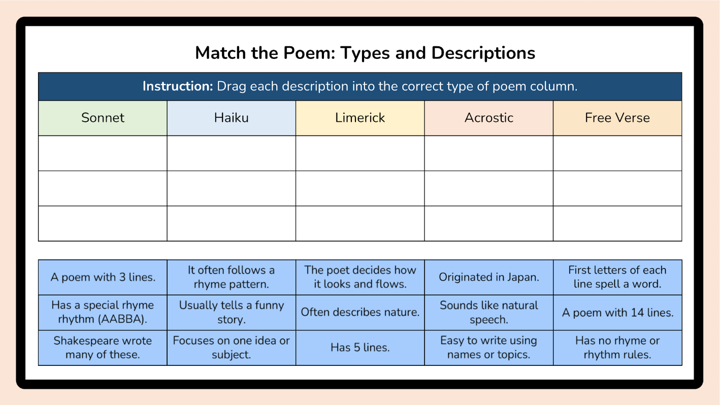 - Types of poems – Haiku, Limerick, Rhyming Poems, Acrostic Poems