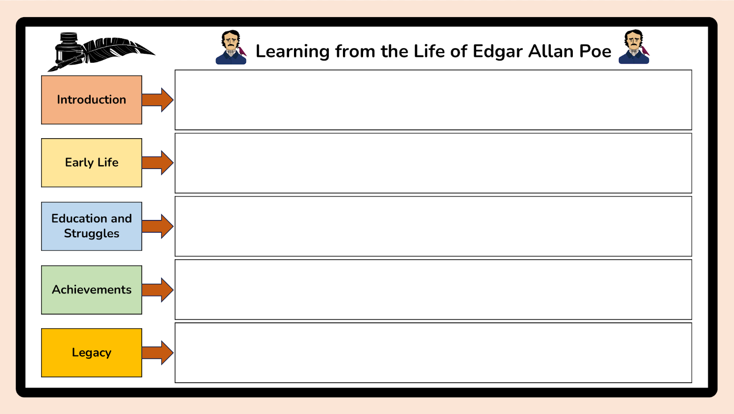 - Narrative structure – exposition, rising action, climax, falling action, resolution
